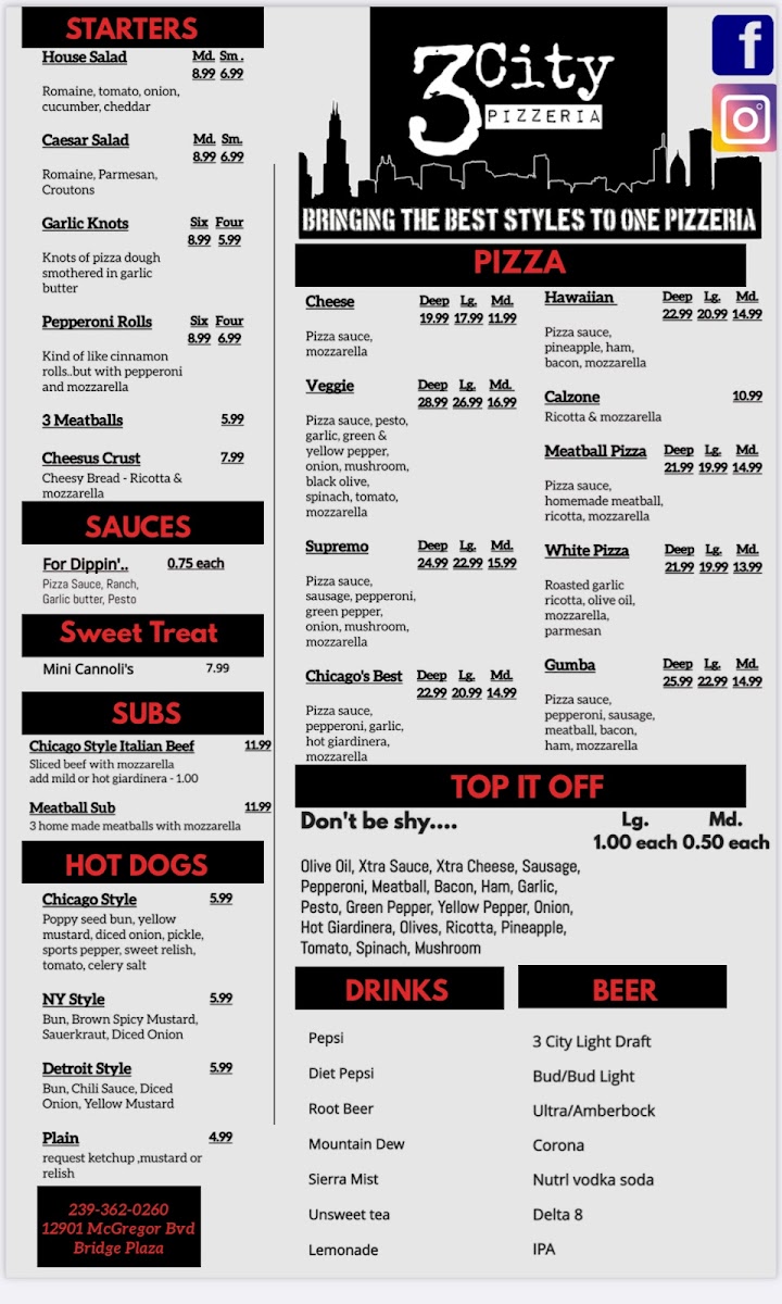 With its diverse and exciting menu, 3 City Pizzeria offers something for everyone-from pizza lovers and salad enthusiasts to those seeking a refreshing drink or a sweet treat. Whether dining in or picking up to-go, this restaurant is a must-visit for anyone in the Fort Myers area.