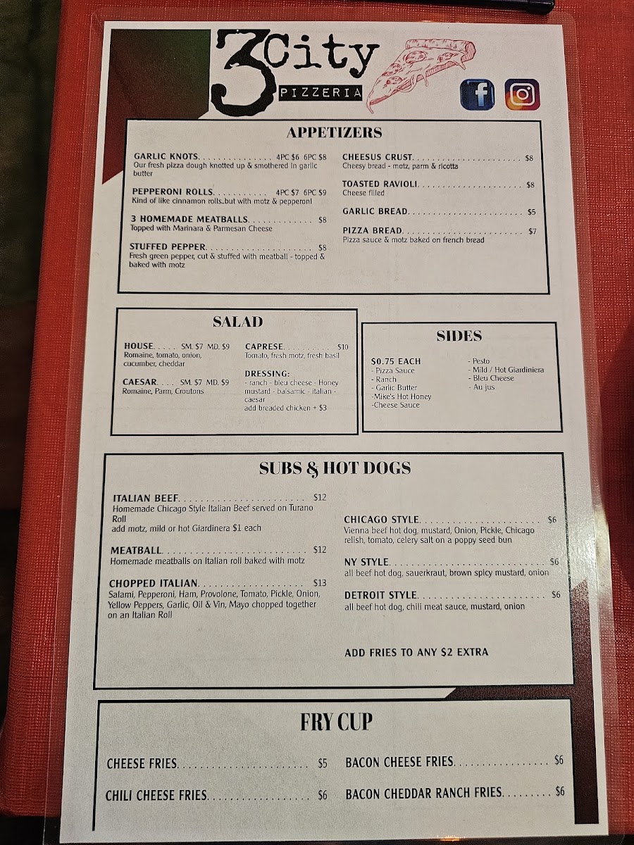 At 3 City Pizzeria, located at 12901 McGregor Blvd #5, Fort Myers, FL, the menu offers a wide array of mouth-watering options, perfect for any craving. Starting off with appetizers, Garlic Knots, Pepperoni Rolls, and 3 Meatballs Cheesus Crust are perfect for a savory beginning. If you're looking for something unique, the Original Pizza Puff is a must-try. Moving on to salads, the classic House Salad, the crisp and creamy Caesar Salad, and the refreshing Caprese Salad provide a light yet flavorful option for those seeking a healthier bite.